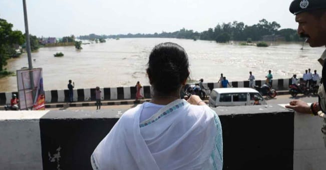 কয়েকদিনের টানা বৃষ্টিতে বর্ধমান, বীরভূম, বাঁকুড়া, হাওড়া, হুগলী সহ একাধিক জেলার বিস্তীর্ণ অঞ্চল জলের তলায়। বুধবার মুখ্যমন্ত্রী মমতা বন্দ্যোপাধ্যায় প্রথমে সড়ক পথে হুগলী ও পরে ঘটালে গিয়ে বন্যা পরিস্থিতি দেখেন। টানা বর্ষণ ও ডিভিসির জল ছাড়ার কারণে একাধিক জেলায় বন্যা পরিস্থিতি তৈরি হয়েছে পুজোর মুখে। বুধবার হুগলিতে বন্যা পরিস্থিতি খতিয়ে দেখতে যান মুখ্যমন্ত্রী মমতা বন্দ্যোপাধ্যায়। সরকারের সঙ্গে আলোচনা না করেই ডিভিসির জল ছাড়া নিয়ে তোপ দাগেন তিনি। কেন্দ্রের বিরুদ্ধে সুর চড়িয়ে এটাকে ‘ম্যান মেড বন্যা’ বলে জানান মমতা বন্দ্যোপাধ্যায়। একথা ঠিক এই শব্দটি মমতা বন্দ্যোপাধ্যায় বিরোধী নেত্রী থাকার সময় বাম সরকারের উদ্দেশ্যে বার বার বলতেন।