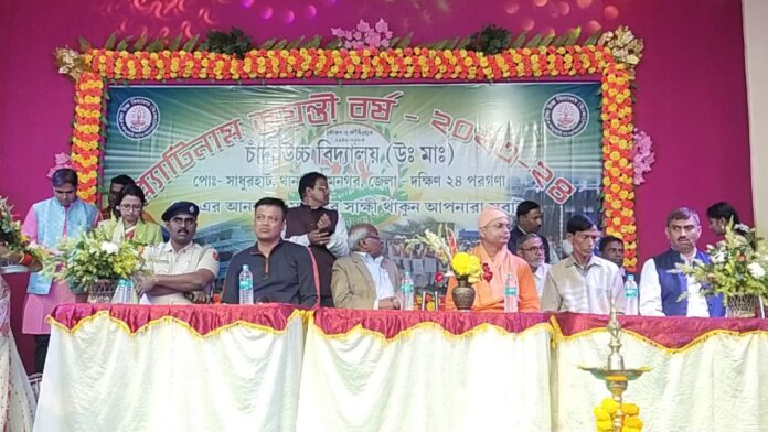 বাইজিদ মণ্ডল ডায়মন্ড হারবার :-  রামনগর থানার অন্তর্গত সাধুর হাট এলাকায় চাঁদা উচ্চ বিদ্যালয় প্রাঙ্গনে প্লাটিনাম জয়ন্তী বর্ষ উদযাপিত হল আজ। ৭৫ তম বৎসর উপলক্ষে বিদ্যালয়ের প্রাক্তন ছাত্র-ছাত্রী থেকে শুরু করে বর্তমান ছাত্র-ছাত্রী এবং বিশিষ্ট গুণীজন ব্যক্তিদের উপস্থিতিতে এই প্লাটিনাম জয়ন্তী উৎসব পালিত হলো। এই অনুষ্ঠানে বিদ্যালয়ের পতাকা উত্তোলনের সাথে সাথে নাচ, গান ,আবৃত্তি ও নাটকের মধ্য দিয়ে প্লাটিনাম জয়ন্তী উৎসব পালিত হলো। এই অনুষ্ঠানে প্রদীপ জ্বালিয়ে শুভ উদ্বোধন করলেন সরিষা রামকৃষ্ণ মিশন শিক্ষা মন্দিরের সহকারী প্রধান শিক্ষক স্বামী শ্যামসুন্দরানন্দজি মহারাজ এবং ATI নেতাজী সুভাষ অ্যাডমিনিস্ট্রেটেড ইনস্টিটিউট পশ্চিমবঙ্গ সরকারের প্রাক্তন মুখ্য কার্যালয় আধিকারিক গৌড়হরি খাড়া, ডায়মন্ড হারবার SDPO মিঠুন কুমার দে, ডায়মন্ড হারবার ADI ব্রজেন্দ্রনাথ মন্ডল এবং রামনগর থানার আইসি তুষার কান্তি সরদার,বিশিষ্ঠ সমাজসেবী কবিরুল ইসলাম শেখ,প্রবীণ সাংবাদিক কিংশুক ভট্টাচার্য সহ চাঁদা হাই স্কুলের প্রধান শিক্ষিকা অনামিকা দাশগুপ্ত সহ আরো অন্যান্য অতিথিবৃন্দ।